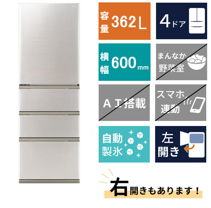 AQUA アクア 冷蔵庫(362L・幅60cm・左開き・4ドア・ブライトシャンパン) 自動製氷機能付き 大容量まんなか冷凍室 AQR-S36RL(N) の 商品概要
