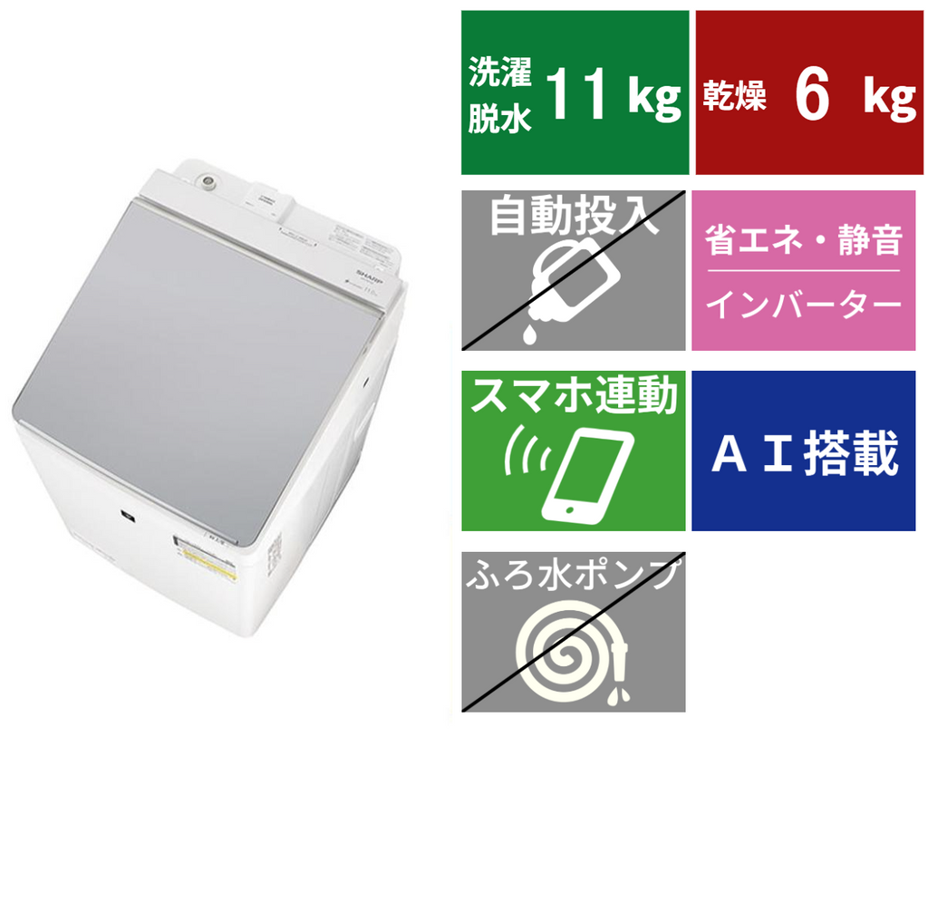 シャープ SHARP 縦型洗濯乾燥機 洗濯11kg/乾燥6kg プラズマクラスター 除菌機能 シルバー系 ES-PW11K-S の 商品概要