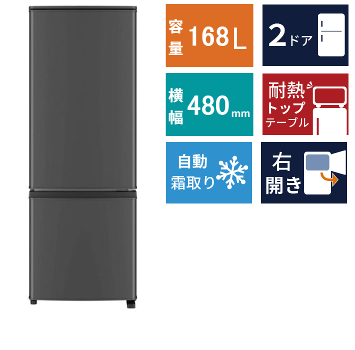 三菱電機 MITSUBISHI ELECTRIC 冷蔵庫 Pシリーズ(168L・幅48cm・右開き・2ドア・マットサンドブラック) MR-P17M-B の 商品概要