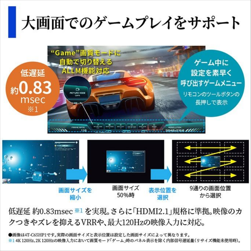 | 接続端子 | HDMI入力端子 | 4系統4端子(HDR対応、入力3:eARC/ARC対応、入力3/4:4K120Hz入力対応) |