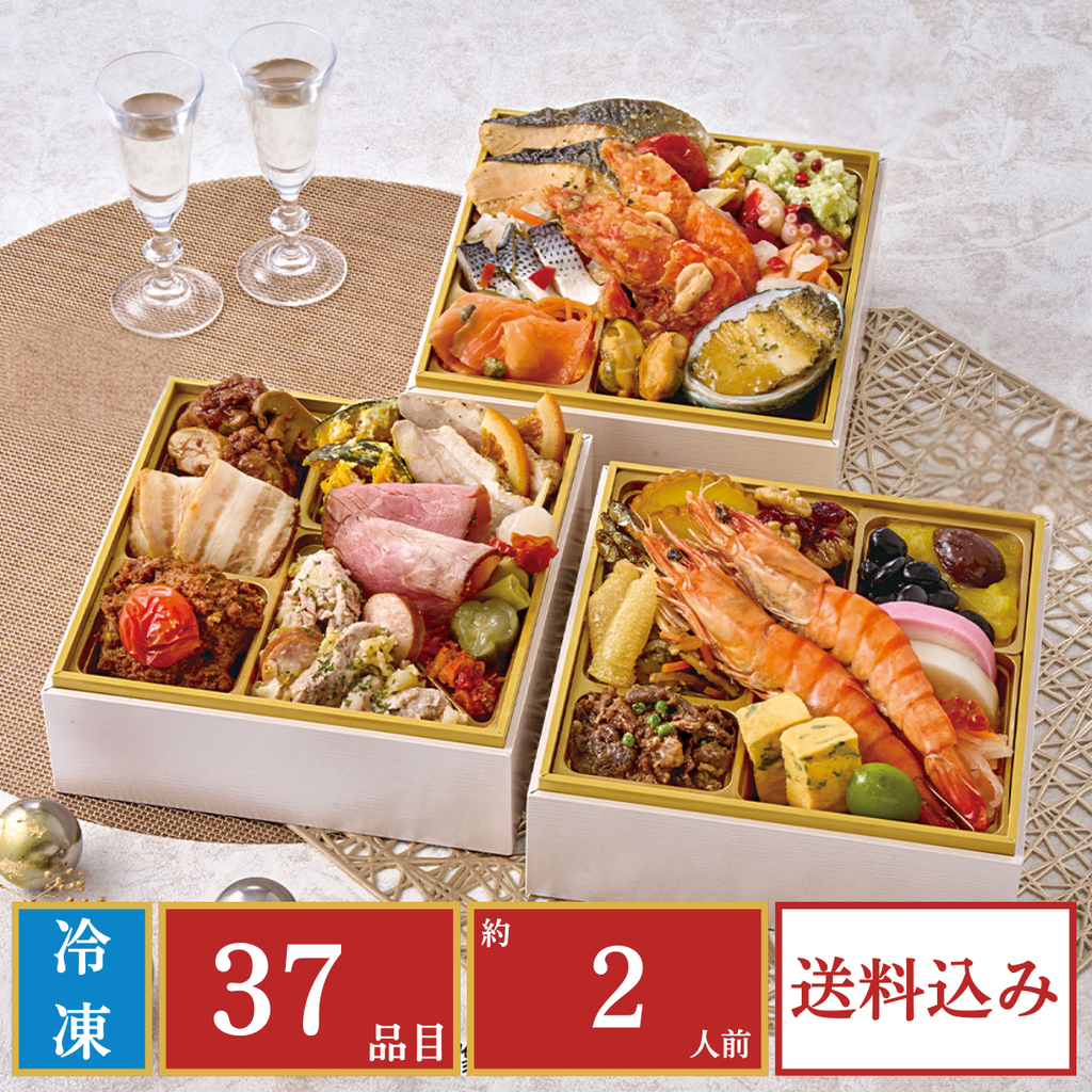 お重サイズ(外寸) | 縦165mm×横165mm×高さ183mm(内寸の高さ(1段)39mm)(37品目)、(約2人前) |