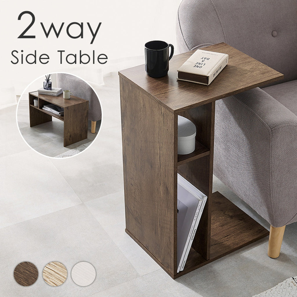 使うシーンに合わせてオープン収納付きのサイドテーブルからローテーブルに置き換え可能な2WAY仕様。木目調のシンプルデザインがお部屋になじみます。