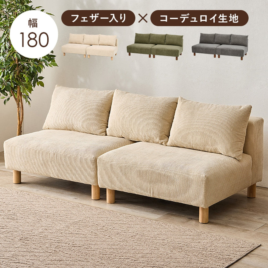 アームレスタイプの幅広ソファなのでゆったりとくつろげます。背もたれクッションと座面にフェザーが入っており体を優しく包み込むような座り心地。