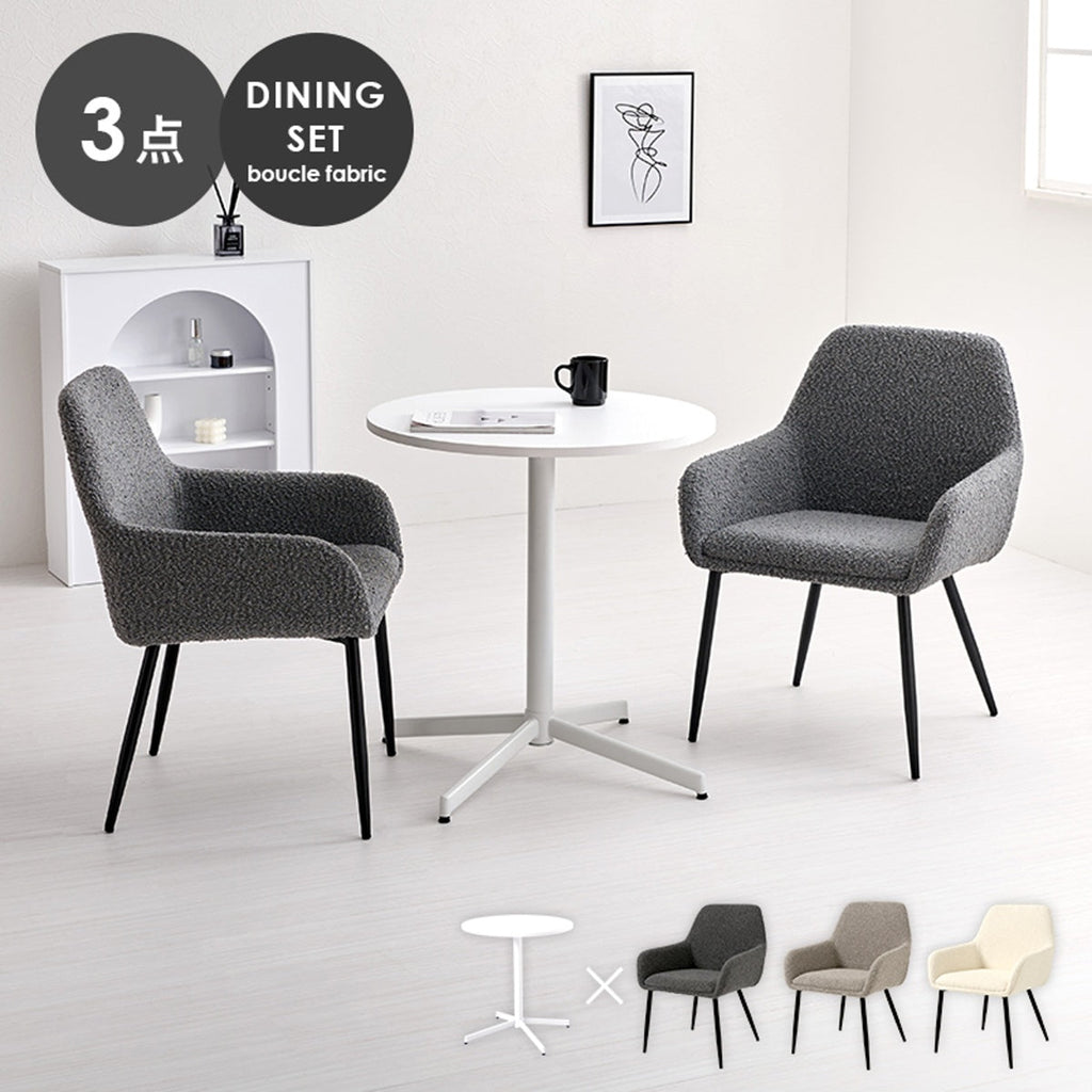 ぽこぽことした質感が特徴的なブークレ生地のチェアとホワイトカフェテーブルを合わせた、モダンでありながら温かみのある雰囲気の3点セット。