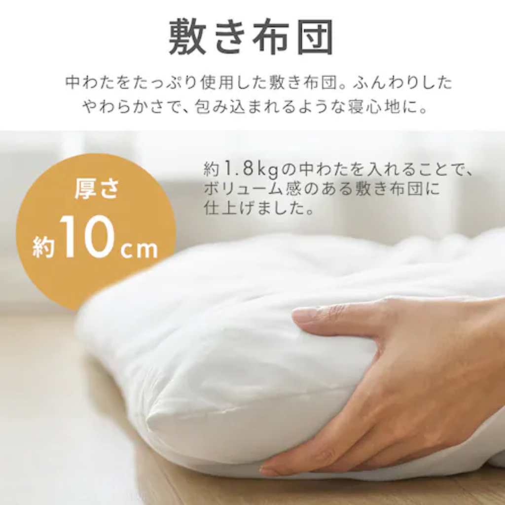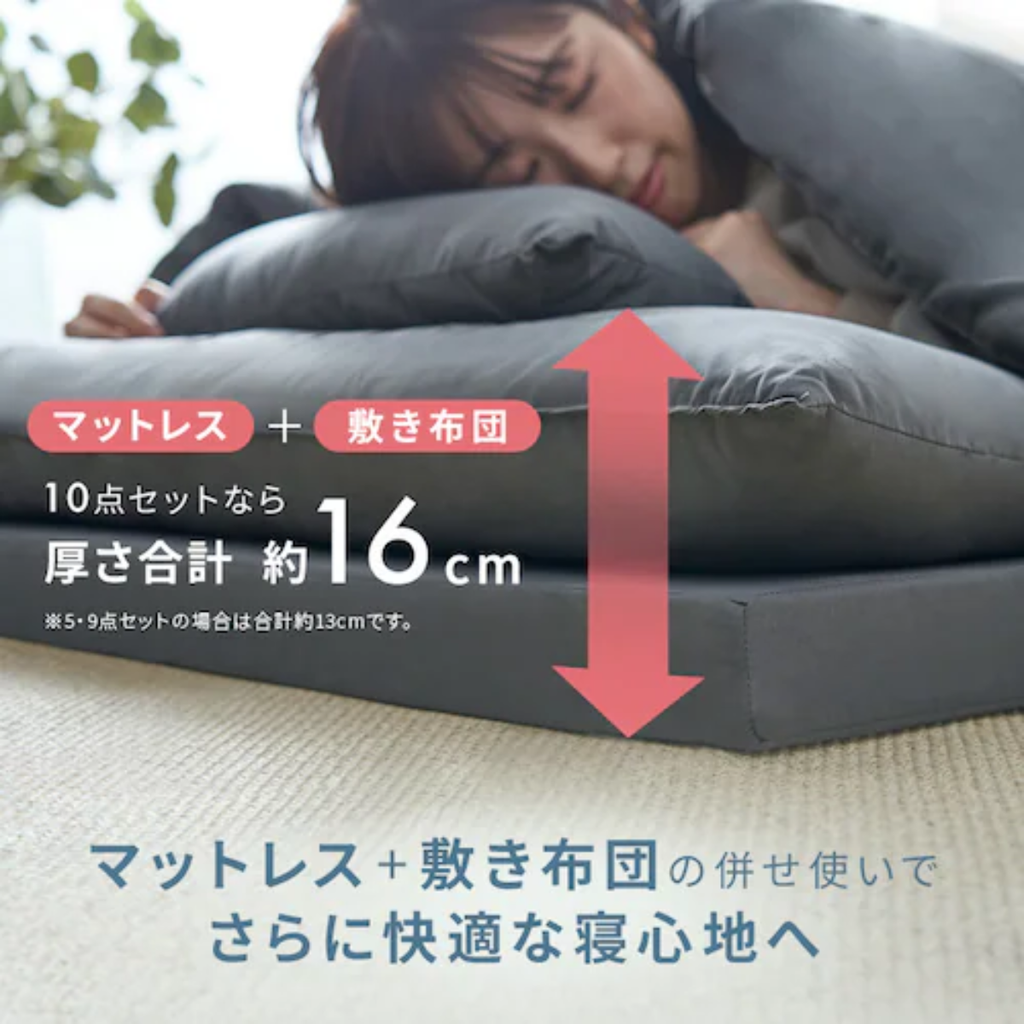 | セット内容 | 掛け布団、敷き布団、枕、マットレス、収納バッグ |