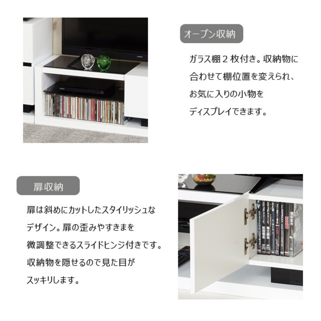 | ポイント | ●お部屋のインテリアに合わせやすいシンプルでスタイリッシュなデザインです。 ●美しい光沢のある鏡面仕上げ。清潔感があり、汚れも簡単に拭き取れます。 ●ガラス天板は、4mm厚ガラスを使用。クッションシール付で、ズレにくい仕様です。 ●背面は置く場所を選ばない化粧仕上げ。 また、背面穴があるのでルーターなどの配線が簡単にできます。 ●オープン収納は、ガラス棚1枚付き。 収納物に合わせて棚位置を変えられ、デッキなどを収納できます。 ●扉収納付き。収納物を隠せるので見た目がスッキリします。 ●扉の歪みやすきまを微調整できるスライドヒンジ付きです。 ●ご使用前に、キズ防止の保護フィルムを剥がしてきれいにお使いいただけます。 |