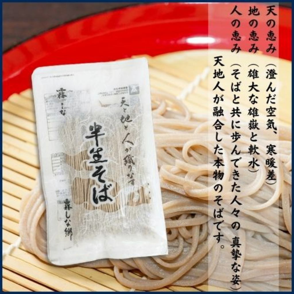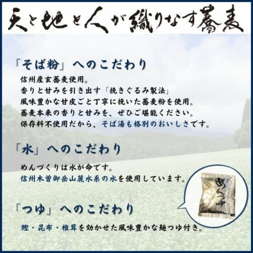 | 原材料名 | めん(小麦粉、そば粉、麦芽糖、食塩)、添付調味料(砂糖、果糖ぶどう糖液糖、しょうゆ(小麦・大豆含む)、 食塩、かつお節エキス(さばを含む)、みりん、かつお節エキス調味料(鶏肉を含む)、昆布エキス、しいたけエキス/調味料(アミノ酸など) |