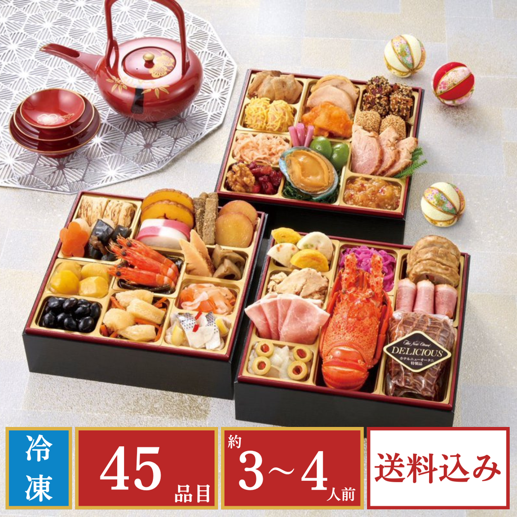 お重サイズ(外寸) | 縦196mm×横196mm×高さ159mm(内寸(1段):39mm)(45品目)(約3~4人前) |