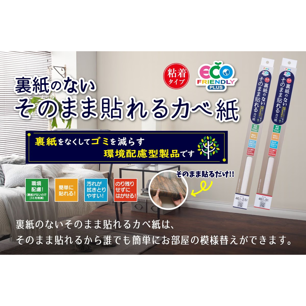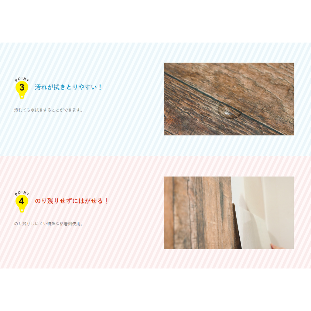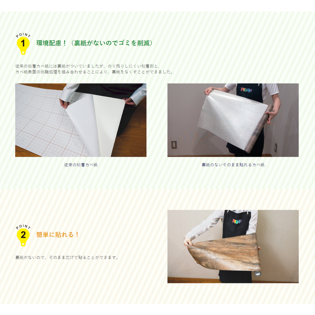 ●本品には下地が透けやすい特性があります。濃い色柄や濃いワンポイントがあるカベ紙に貼ると下地が透けて見えるので避けてください。